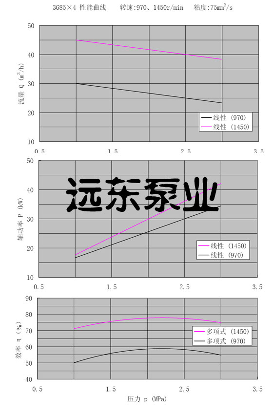 3GR85*4三螺桿泵轉(zhuǎn)速970,1450r/min,粘度75cst性能曲線圖